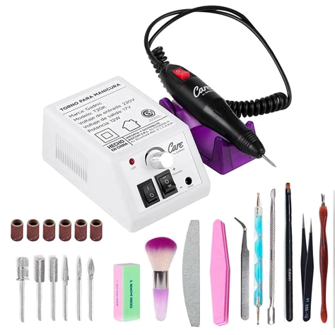 Torno de uñas profesional con cuerpo de aluminio, brocas y limas, ideal para manicuras precisas y eficientes. Giro reversible incluido.